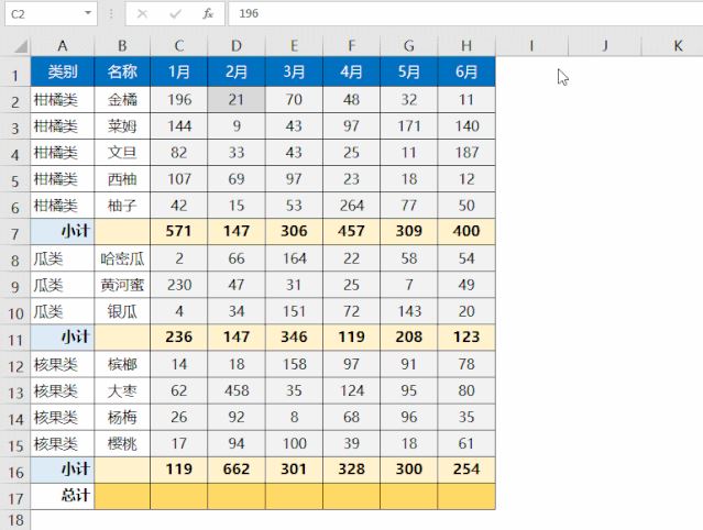 如下图所示,需要批量设置小计行公式。如果C:H列没有空白单元格(如下图所示灰色单元格),先按Ctrl+g定位高阶女祭司洛苏娜空值,然后再按Alt+=设置求和公式。