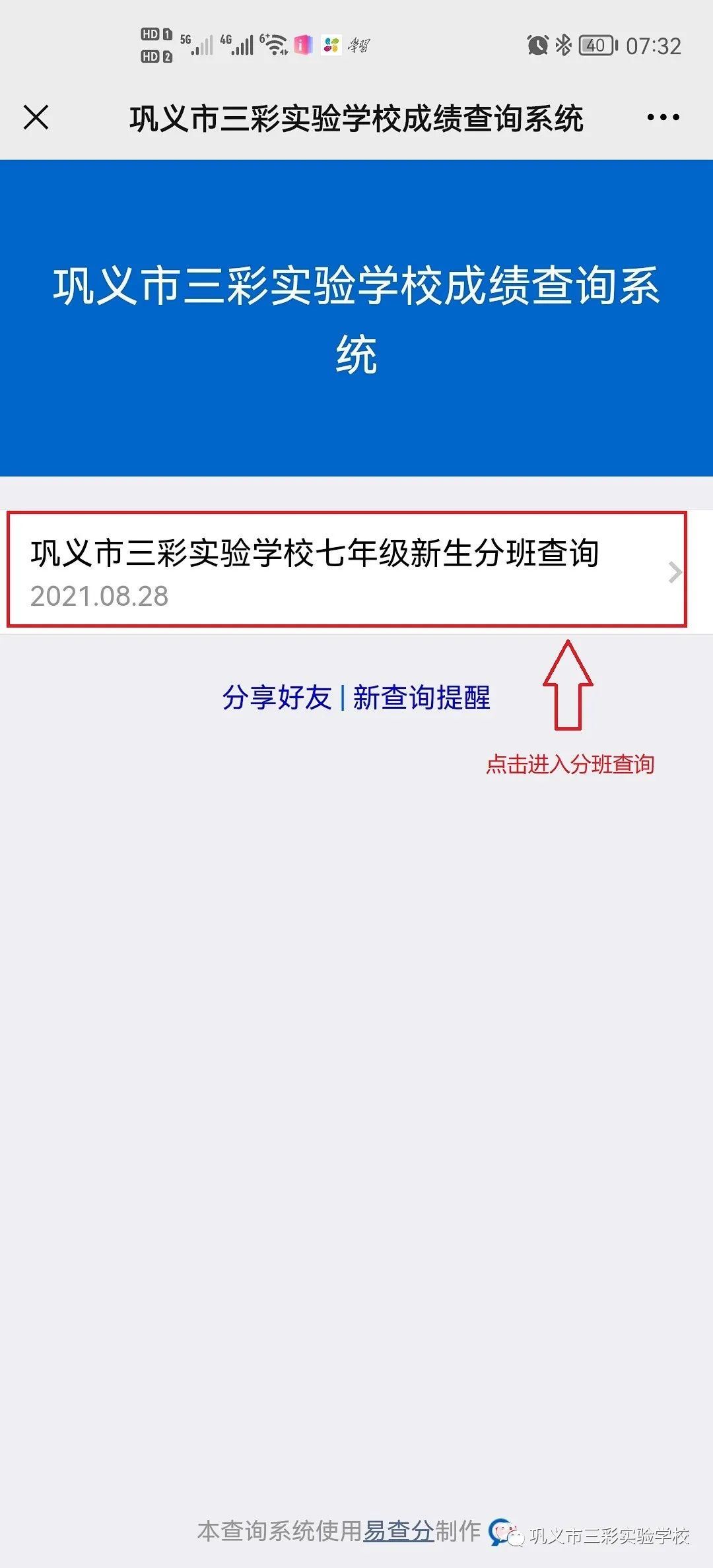 5.点击“七年级新生分班查询”。
