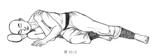 【练法】头向右侧身而卧,右腿屈,左腿伸;右手抱肩,左手覆按床面,自然舒适。