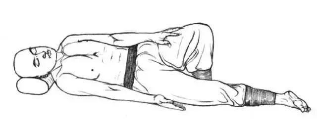 【练法】头向左卧,左腿伸,右腿屈立;左手仰放床面,右手覆按右腿上;坦腹,虽侧身但稍向上。