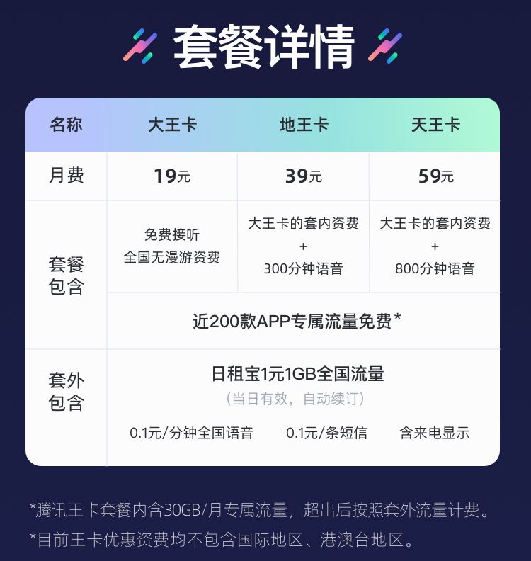 腾讯大王卡:月租19元套餐,每月可最高享受40GB的专属全国流量;套餐流量1元/800M的全国流量(可升级为1元/GB全国流量);0.1元/分钟全国语音通话;0.1元/条信