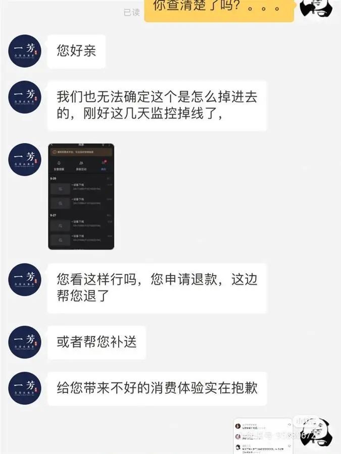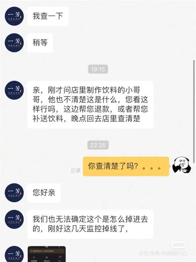 30日凌晨2时34分,该网友第三次发布图片,是其与头像显示为“一芳台湾水果茶”店方的对话截图,截图显示8月29日下午7时许,该网友将图片发给店方问询从黑糖鲜奶中喝出的黑色异物是什么东西,店方回复称问过店里制作饮料的工作人员,工作人员也不清楚这是什么,并称为该网友退款,或者补送饮料,晚点回店查清楚。