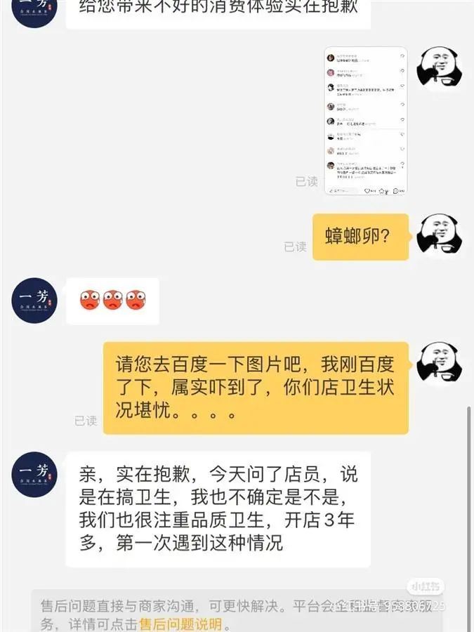 记者注意到,截至8月30日上午10时30分,该网友发布的第一条图片动态的网友评论已达15000条。有多位网友评论称黑色异物为蟑螂卵。该网友8月30日上午9时22分更新图片动态,图片显示该杯奶茶是其在线上平台购买,下单时间为8月29日下午1时27分,是22元的大杯黑糖粉圆鲜奶,下单门店为一芳台湾水果茶灵芝店,并称其已在12315网站投诉,投诉工单已提交至广东省深圳市宝安局处理。