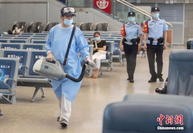 资料图:7月22日,江苏省南京市,南京火车站工作人员在候车大厅内开展消毒工作。中新社记者 泱波 摄