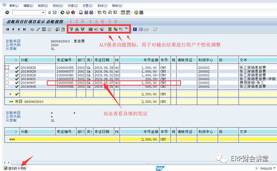 输出结果中,双击某一行可以查看具体的凭证,或者是选中某一行后,点击工具栏中的眼镜图标查看凭证。