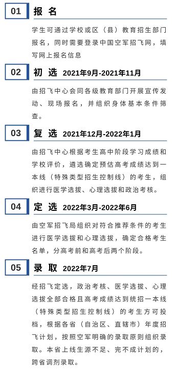 1.选拔程序。根据教育部、公安部、军委政治工作部下达的联合培养计划,空军从招收的理科类高中生飞行学员中遴选确定预选对象,组织到空军航空大学进行军政训练和体验飞行,综合择优录取高考成绩优异、体验飞行合格的学员,于9月上旬入北京大学、清华大学、北京航空航天大学联合培养。