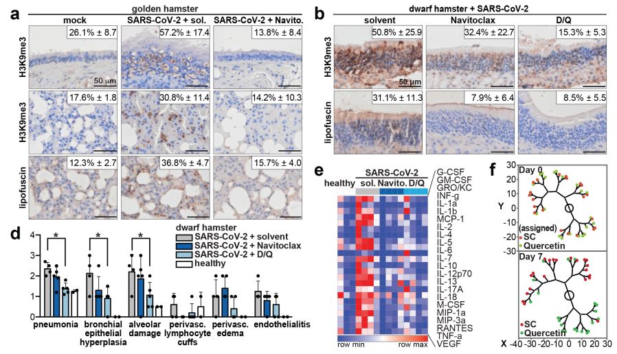 在仓鼠模型中,研究人员们进行了体内实验。他们发现在感染新冠病毒后,这些动物出现了肺部炎症。RNA测序结果也确认,这些动物肺部的细胞出现了衰老特征。而在使用一种BCL-2抑制剂进行治疗后,仓鼠体内的衰老细胞得到了有效减少。同时,它们的血液里的促炎症细胞因子水平也明显下降。在重症新冠疾病的动物模型中,另一种酪氨酸激酶抑制剂的效果则更突出。结合一些临床试验的结果,研究人员总结指出,如果在新冠感染的早期使用抗衰老药物进行干预,可以很大程度上减少肺部疾病的严重程度,也能减少系统性的炎症。参考资料: