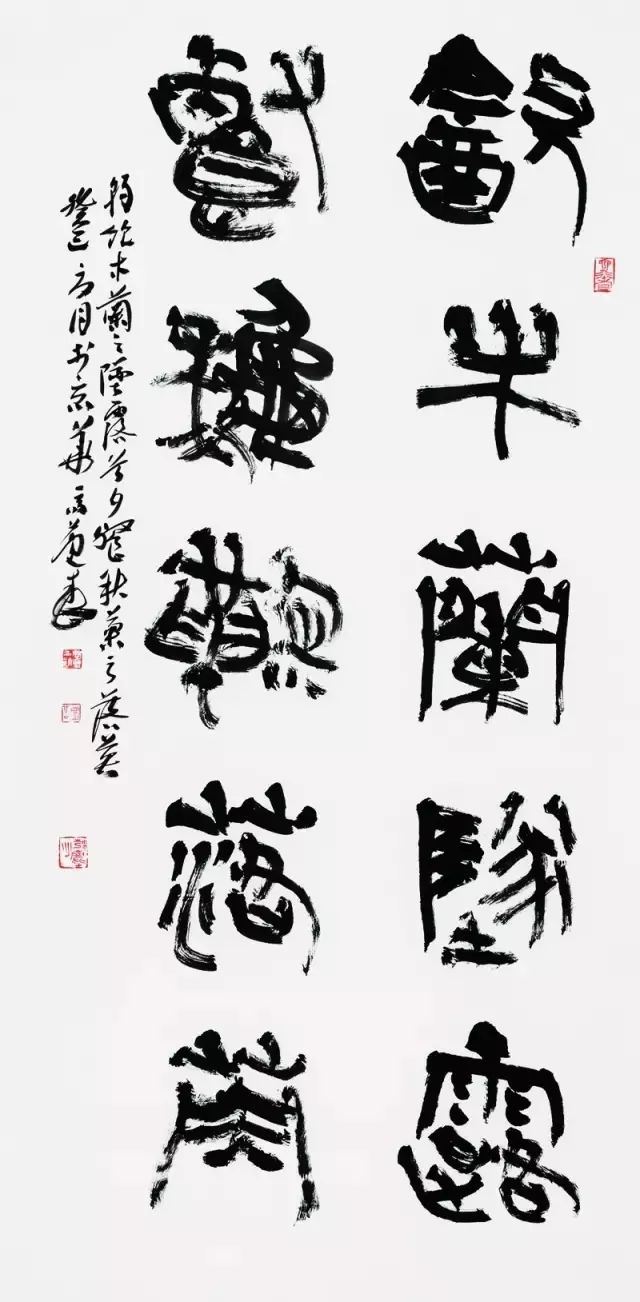 吴昌硕经年沉潜于诗书画印之中,陶冶性情,变化气质,可以把先秦古雅肃穆的《石鼓文》写的开张恣肆,不可一世,是基于他自身强大想象力的缘故??梢运担桓龃邮乱帐醮醋鞯娜?,假如在想象力方面有缺失,将注定其艺术生命不能久长。就书法创作而言,大多数作者很容易凝固在一条旧有的创作思路上。当我们打开一些书法展事的《作品集》,会发现某些老名家的最新作品与之十年前,乃至二十年前、三十年前的旧作相较,变化并不太大,凡读到此类作品大都会给予我们一种僵化陈旧的审美体验。造成这种情状的原因,大体是因为这类作者想象力的贫弱。20世纪90年代以来,大量的楚简、楚金文文字资料在两湖地区出土,最新的考古发掘报告,深刻影响着当代的篆书书法创作。20世纪末楚简文字的鲜活面世,其作用实在不亚于20世纪初,甲骨文、汉简牍出土对书法史的影响。如果说甲骨文、汉简牍的出土,一方面使我们清晰体察到吾国文字之祖甲骨文的完整面貌,另一方面我们又可以通过汉简牍墨迹的真面而窥得汉人用笔的精髓所在,不会再从汉碑剥蚀的刻划中去作“刻舟求?!笔降姆悍褐?,那么相较于甲骨文与汉简牍,楚简文字的出土则完全颠覆了我们既有的汉变秦法、隶变篆法的习常看法,事实上隶书用笔的提按变化,早在先秦之前已有成熟体例,大量楚简文字中所表现出的线条意识,是足以令我们感受到原来先秦书法还有另一面——生机勃勃的活力体现。当这么多的最新古文字考古成果展现在高庆春面前时,他敏感地意识到,个人书法艺术创变的契机到来了!高庆春在披览这些奇诡的楚简时,既惊异于上古书手的奇异想象力,此外这多奇诡的字形也在诱发着他内心深处所蕴含的高妙想象力勃发。自兹始,高庆春的书法创作显见又要迈向一个更高的境界了。