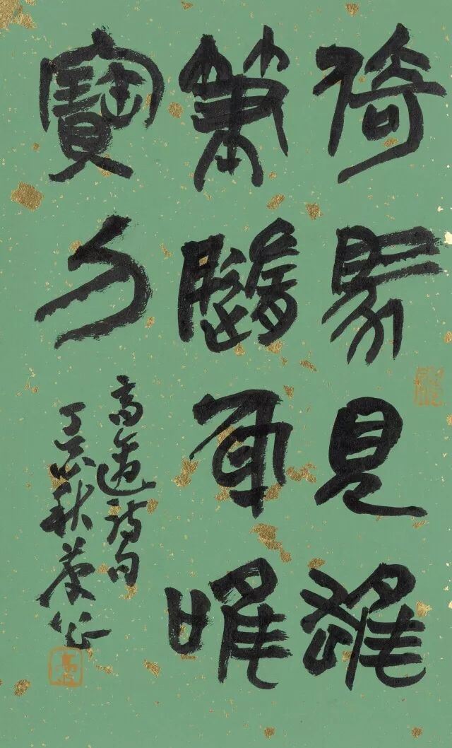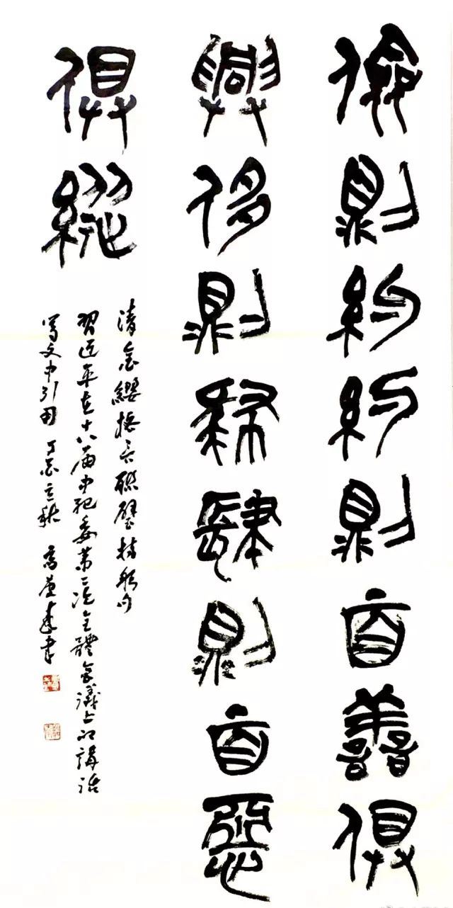 高庆春的篆书创作正是发轫于邓石如一脉的艺术表达型篆书创作体系,而尤对于这个学术谱系中的吴昌硕篆书会意独多。众所周知,吴昌硕以善学《石鼓文》书法享誉于世,但他笔下的《石鼓文》书法与作为秦篆先导的《石鼓文》书法原石却大相径庭,后者整饬妥帖,因完全异于六国文字而独称“籀文”,而吴氏笔下的《石鼓文》起笔粗重,线型葆有明显的顿挫笔意,至于在结体上更是左低右高,有意错落结字,不取原石字法的等匀。在我看来,吴昌硕取法《石鼓文》可归为是一种作为创作依据的临摹,这类临摹学古方式堪比“借题发挥”,正是借古人之“题”作个人的发挥?!澳氐闫魄镖ぺ?,苦铁画气不画形?!蔽獠段蘼圩骰魇榻允且运吮平阶晕倚刂兄槔?,因之“画气”与“写气”也正是吴昌硕艺术创作的灵魂所在。以高庆春早期的书法作品为观照,不难发现,吴昌硕《石鼓文》书风的影响对他是一种素丝初染式的浸洗,而且吴氏《石鼓文》书风的因子长期追随着他。高庆春在青年时代无论写小篆、汉篆乃至金文,都可以在古篆庄重典雅的线型中,融入一些活泼有趣的表现。笔毫时时在腕指之间翻转捻动,于不动声色的用笔动作中行笔速度自然就有了变化,故而线条的趣味也随之产生差异,庄重之外生出了灵异之气,恰似长江秋清,千里一道,冲飙激浪,瀚流不滞,个人所主的作书全以气魄夺人为胜,不在乎句栉字篦的审美理想最初成型矣。在这个时间段里,高庆春以金文长联为主体的书法创作频频入选国家级重要书法展事,同时他在金文书法创作方面的成果也滋养着他的篆刻创作,此际他的篆刻创作以三代古玺为尚,这恰是其金文书法创作的凝练表达。