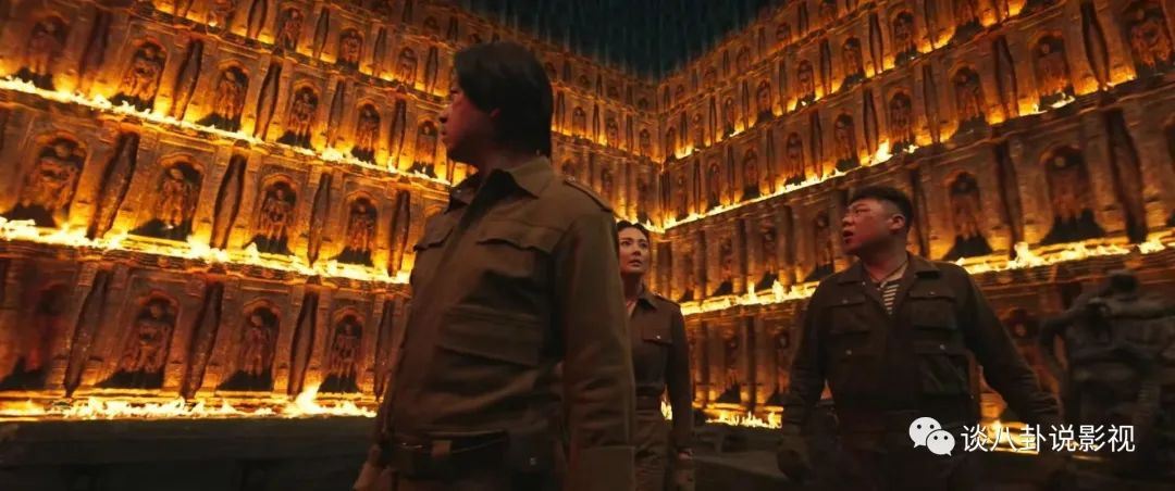 胖子吃“腊肉”那里,发现了尸油槽,然后一把火下去,那一排排的干尸清晰可见,那一圈一圈的火苗尤其壮观,然而此处有多壮观就有瘆人,虽然整部戏在这里的台词或是解说几乎没有,但仅仅就这一个点火镜头,就把献王这个为君者的残忍展现得淋漓尽致,而且对观众来说杰克琼斯手表后劲极强,细思极恐,这可比乌头肉芝、血棺、痋人等东西恐怖多了。
