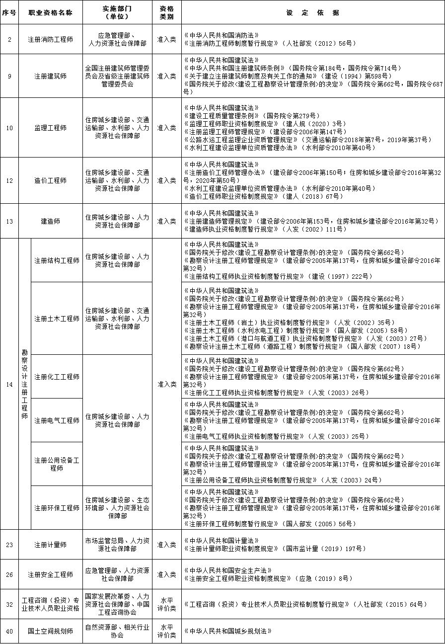 2:原注册城乡规划师调整为水平评价类,更名为“国土空间规划师”;原注册设备监理师调整为水平评价类,更名为“设备监理师”;原土地登记代理专业人员职业资格更名为“不动产登记代理专业人员职业资格”;原专业代理人更名为“专业代理师”。
