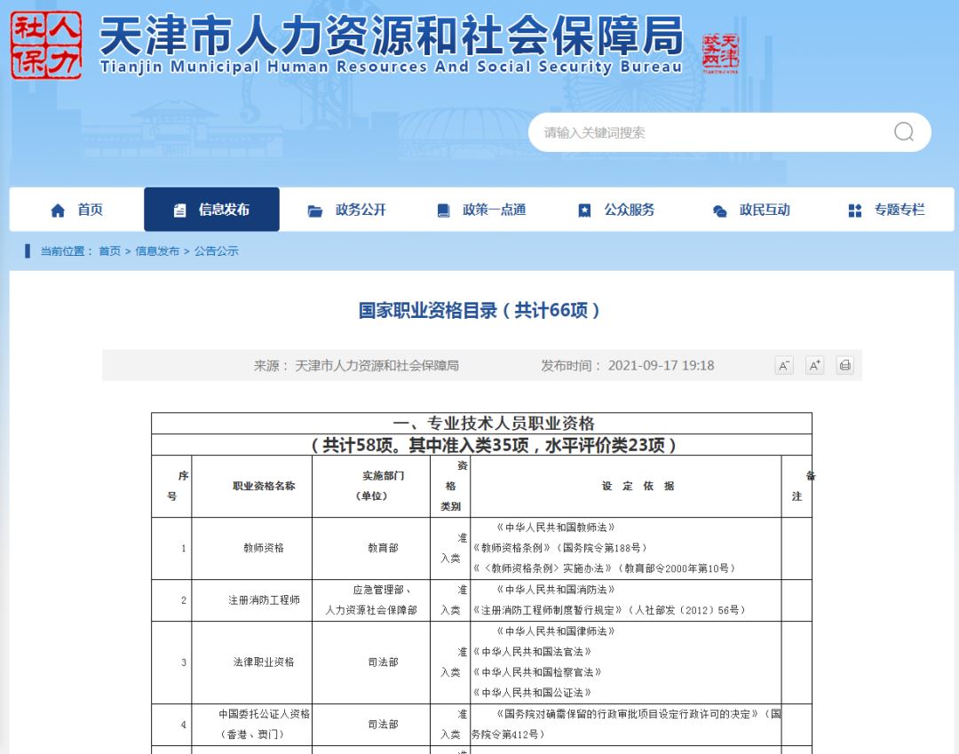 天津市人社局公布的《国家职业资格目录》网址:http://hrss.tj.gov.cn/xinwenzixun/gggsnew/202109/t20210917_5602283.html