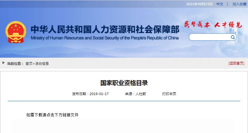 2019年人社部官网职业资格目录
