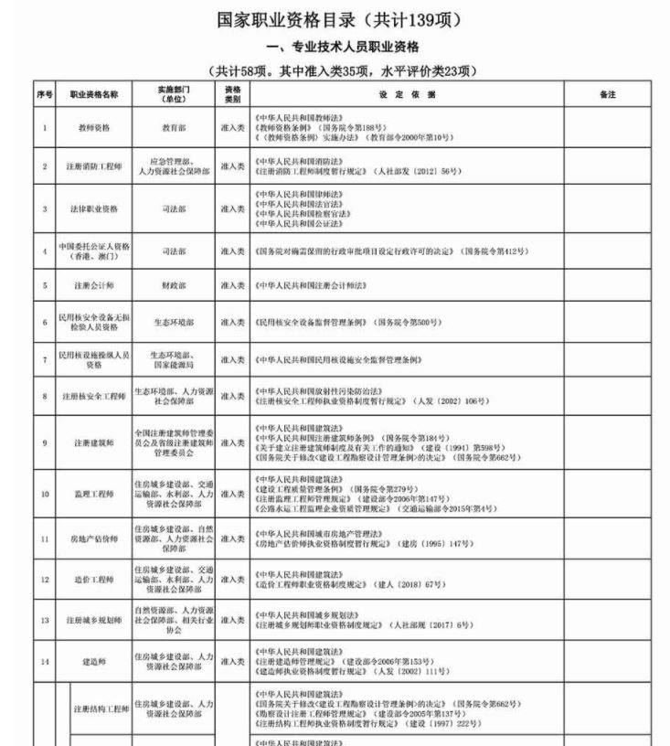 专业技术人员职业资格 目录(部分)