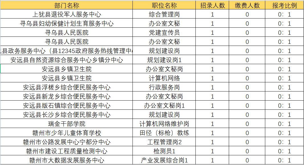 截止到23日17:00,赣州市事业单位已有9570人报名,其中报名总人数排名前五名的岗位依次是:赣州市住房公积金管理中心会昌分中心、寻乌县县直事业单位捆绑岗②、赣州市农业综合行政执法支队章贡大队、赣州市大数据发展服务中心、赣州市党外代表人士联络服务中心、赣州市政协委员联络中心。