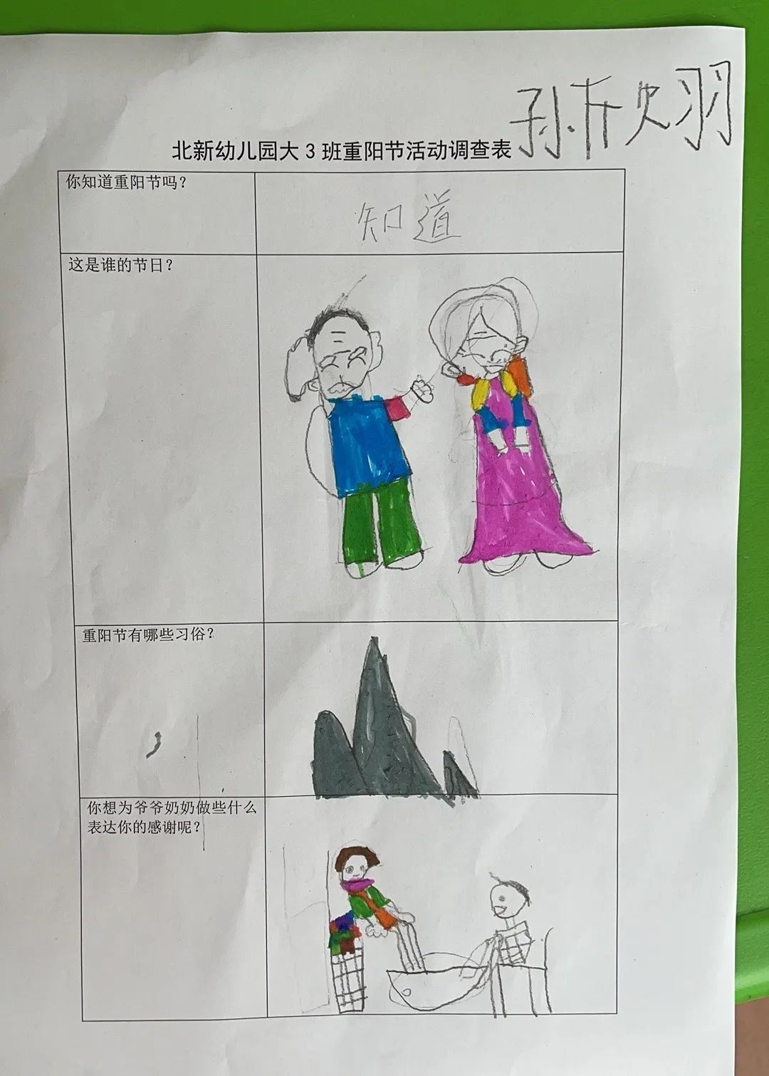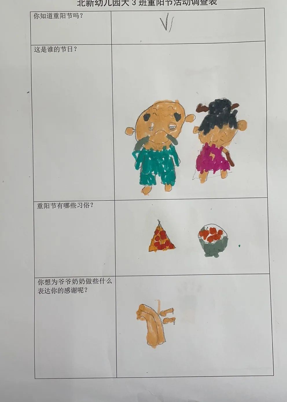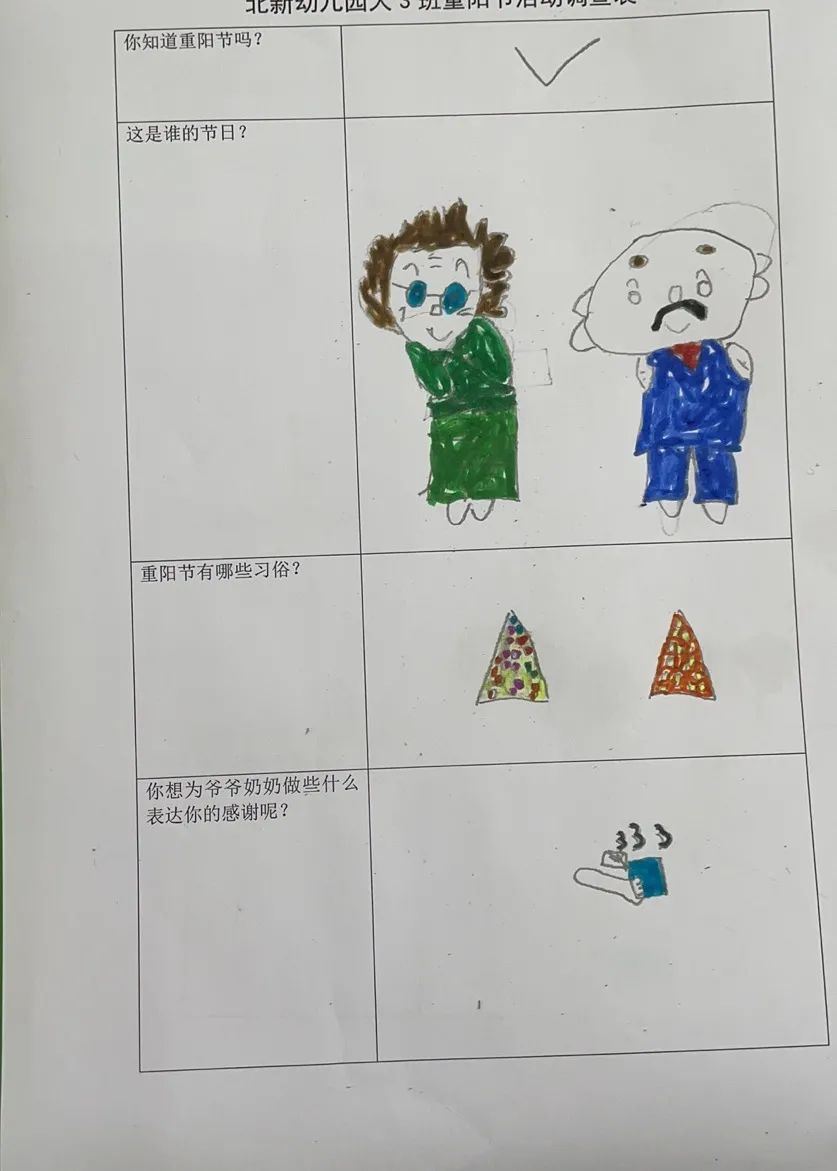 九九重阳节,我是小小调查员。大3班爱乘爱小朋友用稚嫩的笔触画下关于对重阳节的了解:重阳节是谁的节日呢?重阳节有哪些习俗?你想为爷爷奶奶外公外婆做些什么表达你的感谢呢?