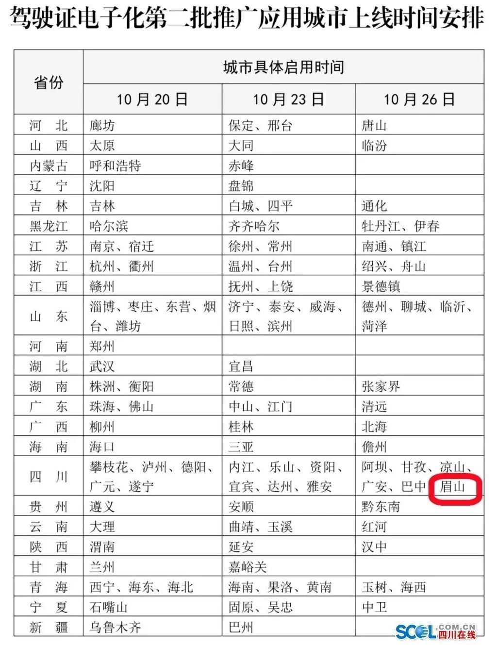 10月13日,公安部交通管理局发布驾驶证电子化第二批110个推广应用城市名单。在公布名单中,眉山市作为第二批推广应用城市,将于10月26日上线电子驾驶证申领功能。