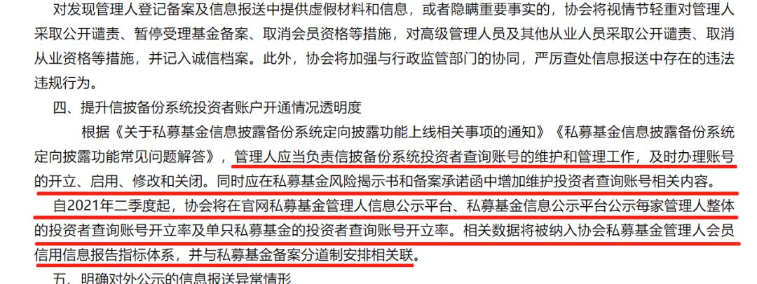 其次,协会从二季度开始统计管理人及其产品的信披账户开通率,与管理人协会信用分挂钩,将来会影响产品备案速度;