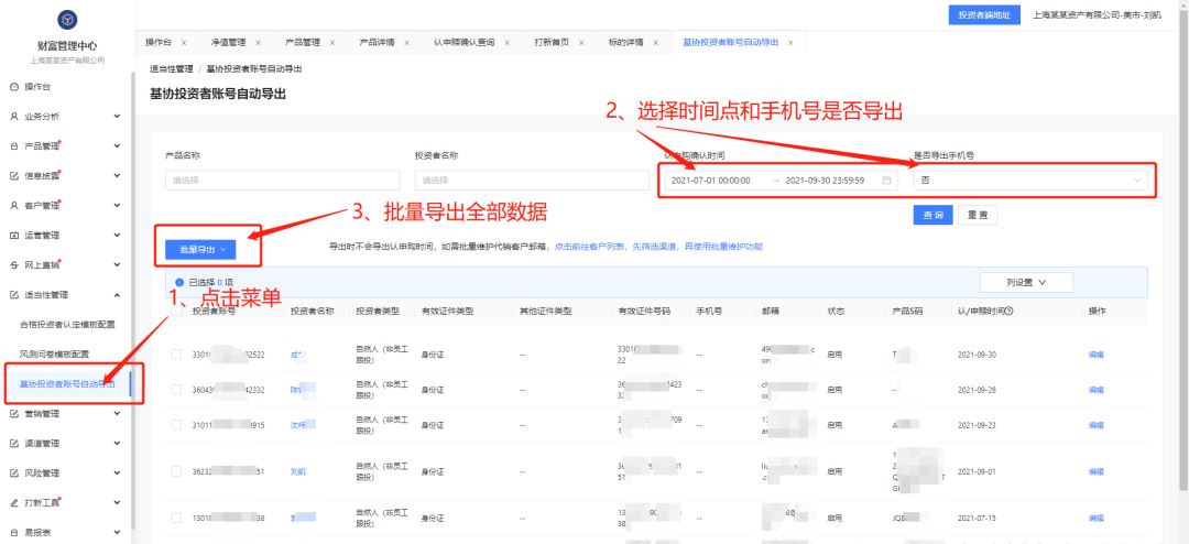 易私慕来送法宝了——基协投资者查询账号一键导出功能,可月亮上的人儿啊以把投资者的信息,一键导出为符合协会批量上传要求的文件。然后前往协会信披备份系统一键上传,简单2步,即可快速批量开通!