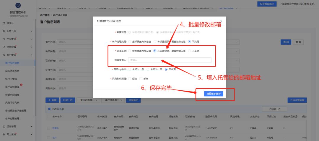 代销客户的邮箱,可以通过易私慕的客户管理功能来进行统一修改,修改后,即可利用上文提到的基协投资者查询账号一键导出功能,进行标准化导出,然后上传至协会系统批量开通。