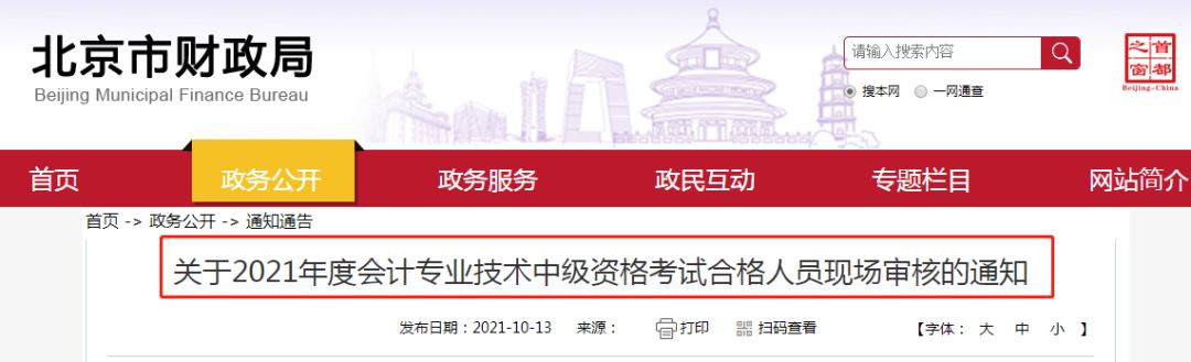 北京财政局发布《关于2021年度会计专业技术中级资格考试合格人员现场审核的通知》,明确表示:2021年度全国会计专业技术中级资格考试成绩将于10月20日公布!