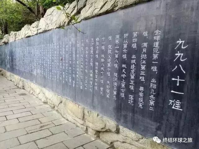 行过陡坡塘瀑布,便来到西游漫道。这里最值得一看的,便是这“九九八十一难碑”,碑文字体娟秀,详细记录了西游记唐僧师徒四人所遇到的八十一难。