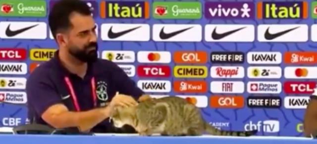 巴西国家队前锋维尼修斯在参加1/4决赛发布会时,一只意外乱入的喵星人闯入了赛场,非常轻松的在桌子上趴了下来。看到这一场景,维尼修斯以及教练甚至诸多的记者们都非常的开心,旁边的新闻工作者甚至当场撸起了猫。为了威尼修斯能够安静的回答记者的问题,旁边的新闻工作者便抓起了猫的脖颈将它扔下了桌子。这一行为引起了记者的惊讶,巴西的新闻工作者也感到非常的困惑,这一意外情况也引起了诸多网友的讨论,刚开始还觉得小猫给发布会带来更多的惊喜,随后将小猫扔下桌子的行为也引起了诸多网友的指责。
