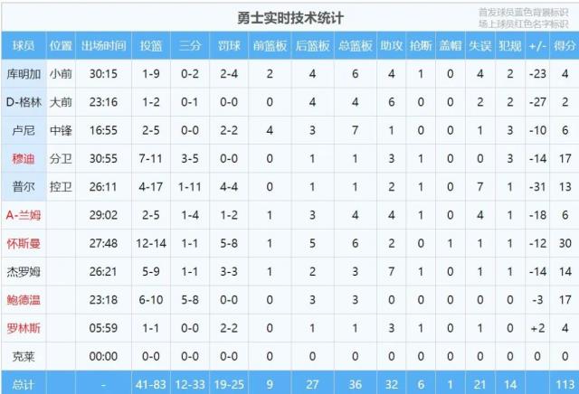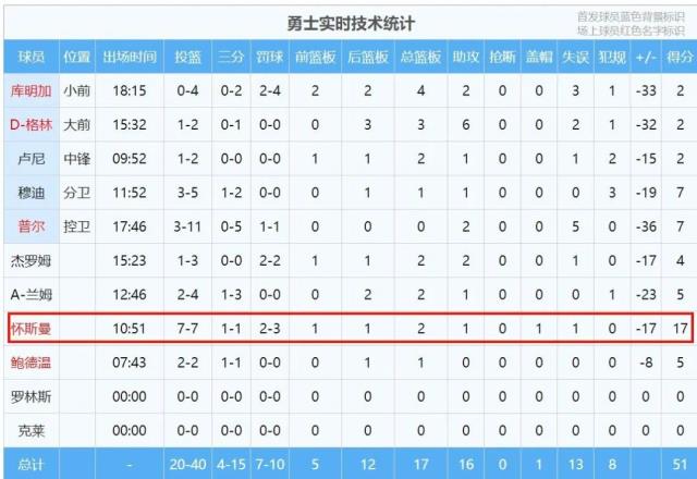 勇士上半场表现最好的球员是谁?大家绝对想不到!怀斯曼:正是在下!怀斯曼替补出场10分51秒,7投7中,三分1中1,罚球3中2砍下17分2板1助1帽。得分是勇士最高,也是全队唯一得分上双的球员。正负值-17,并列勇士全队第三高。