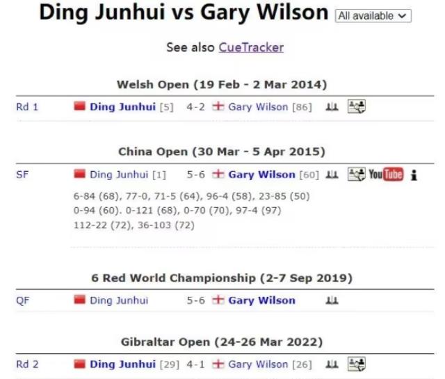 丁俊晖在2014年威尔士公开赛首轮以4-2获胜,在2015年中国公开赛半决赛以5-6获胜,在2019年6红球世锦赛四强以5-6获胜。两人上一次交手是在去年直布罗陀公开赛的第二轮,丁火箭季前赛俊晖以4-1轻松获胜。