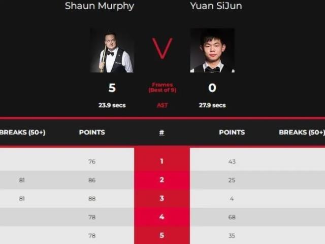 除了田鹏飞5-0痛击奥沙利文之外,还有一场比赛也是5-0,那就是肖恩-墨菲5-0痛击袁思俊。在这场比赛中,肖恩-墨菲在第二和第三局中连续得到81分,并在第四局中实现了单局逆转,当时他得到了超过8分。凭借这场胜利,肖恩-墨菲现在将面对乔-奥康纳和潘俊树之间半决赛的胜者。