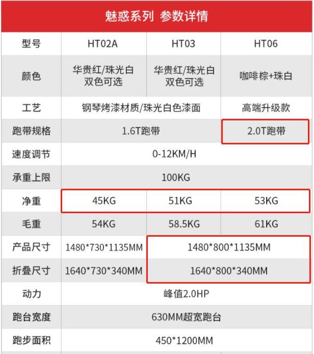 区别:HT02A是单臂(尺寸稍小一点),HT03是双臂(尺寸和HT06一样大),HT06双臂还增加了侧扶手(更安全)、承重更好、跑带升级。
