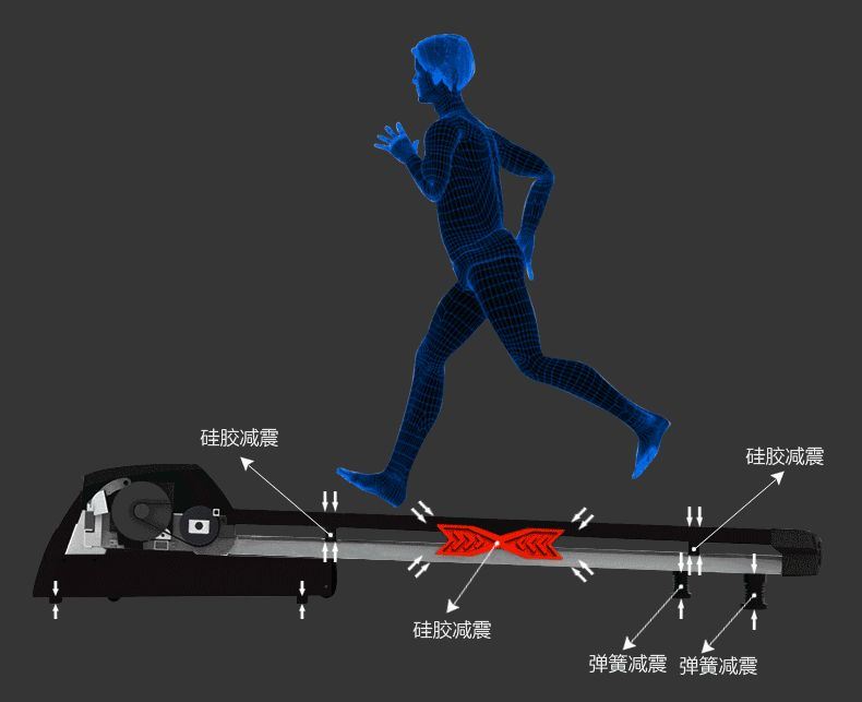 6、减震系统,脚跟跑步机接触,会产生较大的压力,对人体关节骨骼部位产生冲击,好的减震系统可以很好的?;す亟谑芩穑懿交?b>硅胶、空气、弹簧、牛筋轮、复合减震几种方式,目前中国跑步机十大品牌中,采用硅胶+弹簧+空气+牛津等组成的复合减震居多。