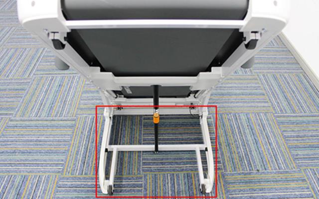 两台跑步机的跑板尾端接触地面的方式不太相同,千元机的跑台尾端是使用可以调节升降的滑轮接触地面的,而百元机的跑板尾端是通过两个很小的橡胶柱接触地面的。