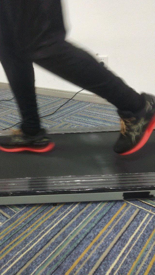 奔跑过程中能够看到跑板产生明显的上下形变,在弹簧减震柱和气囊减震块的共同协作下,整个跑台中部的弹性反馈较为明显。