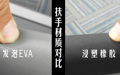 几百元的跑步机扶手不仅没有心率检测装置,而且使用的是较薄的浸塑橡胶材质,触感上十分坚硬,没有柔软材质的包覆,如果不小心磕碰到,坚硬的扶手没有任何保护效果。