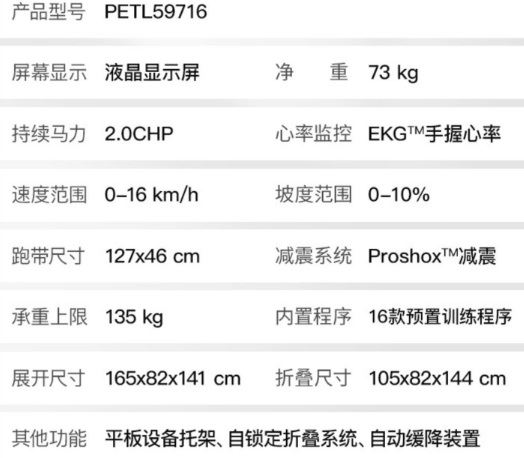 跑带区域: 1擃27x46cm;跑步机最年夜承重: 135kg;坡度调剂方法: 电动;连续输出马力: 2.0hp;峰值马力: 2.7hp;速度调节规模: 0-16Km/h。