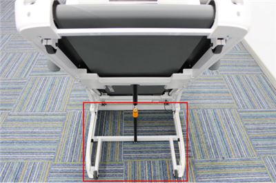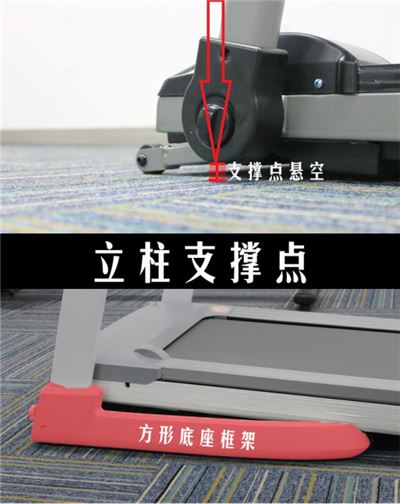 仔细探究一下原因,可以发现,立柱下方支撑点的设计,才是造成机身不稳定的重要原因。这台百元机的立柱下方与地面间有一段小小的悬空距离,由于立柱所受的从上至下的力,如果无法直接传导到地面,就会带动整个跑台侧翻,所以在上面跑步的人一旦重心不稳去扶扶手,整机侧翻的风险较大。