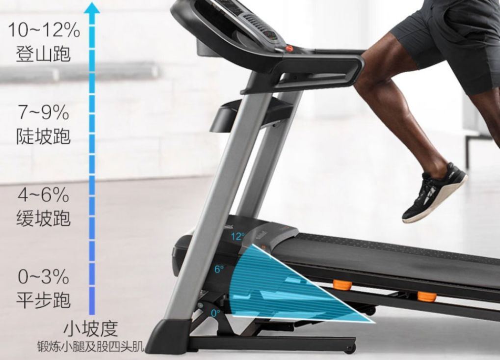 跑步机的常见倾斜度在0~15°之间,倾斜度的设置可以增大运动量,加大运动强度,从而提高运动效率,同时可以避免单调的跑步运动。选择合适的倾斜度,再搭配合不同的速度,可以达到意想不到的锻炼效果。