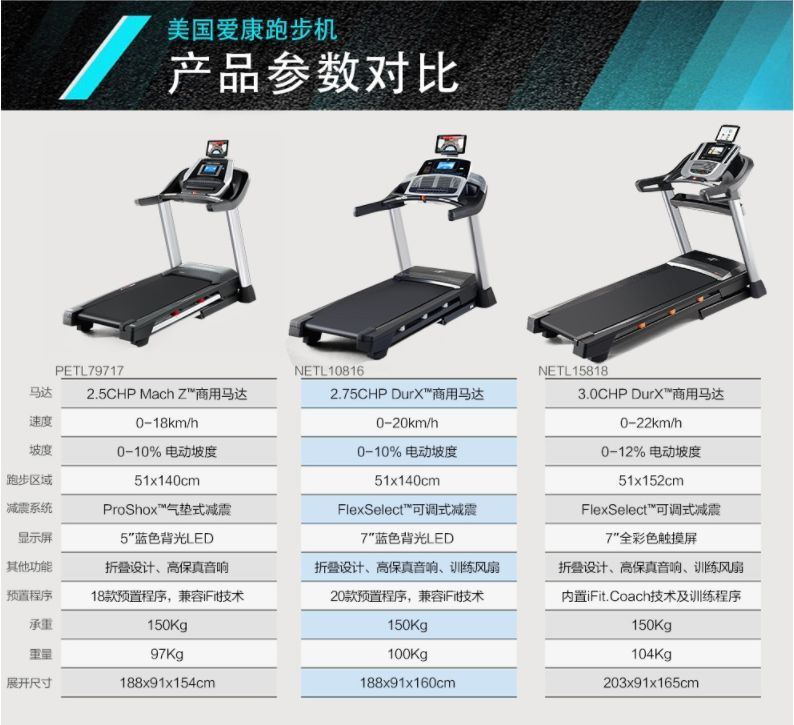 分别搭载的是2.5CHP、2.75CHP、3.0CHP马力的商用马达,根据自己的预算进行选购,当然个人比较推荐2.75CHP商用马达的爱康10816/T7.0家用跑步机,性价比更高!