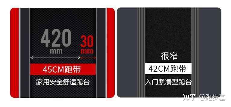 跑道的宽度一般在42~52cm之间,如果宽度小于跑步者的肩宽,那将非常的难受,所以跑道宽度一定要注意!商家平常说的宽度都会加上两边的跑步基边宽,所以我们要明确有效宽度跑带宽度