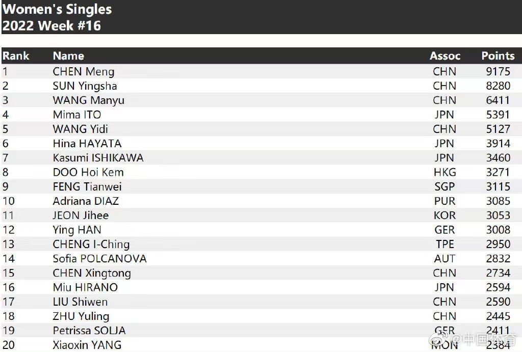 // 世界排名|国际乒联第16周世界排名出炉 国乒三项领跑 //