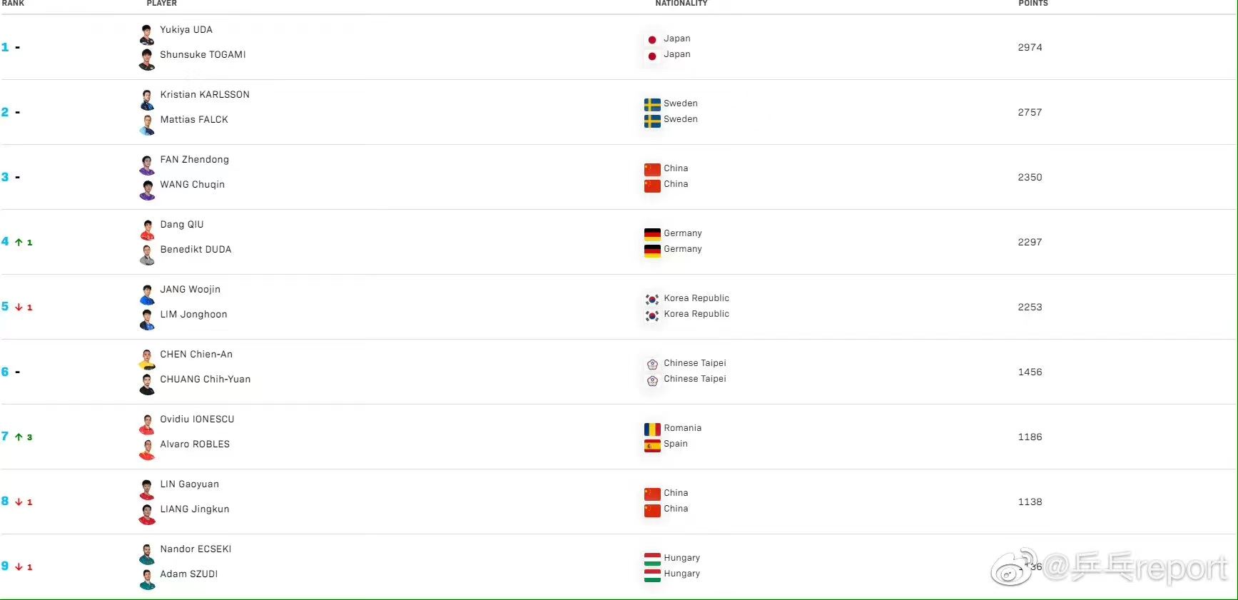 双打方面,男双积分榜中,WTT多哈球星挑战赛男双冠军组合邱党/杜达超越韩�国组合张禹珍/林钟勋升至第四位,两对中国组合樊振东/王楚钦、林高远/梁靖崑分别位列第三和第八。女双方面,“海产姐妹”榜首位置稳如泰山,日本组合木原美悠/长崎美柚接连在多哈斩获女双两金,排名上升七名来到世界第五?;焖迮琶涠淮螅蕉灾泄楹纤镉鄙?王楚钦、刘诗雯/许昕排名分别维持第二与第六不变,世界第一依然是中国台北组合林昀儒/郑怡静。