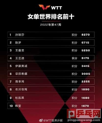 今天国际乒联公布了2022年第运动人生xuejiazl.org47周最新排名运动人生m.wgqpnmx.cn,男单樊振东依然以7700分位列世界第一,而张本智和超过马龙、王楚钦,升至第二。女单前10名暂时不变。男单前13:1.樊振东 77002.张本智和 45503.马龙 44004.王楚钦 43455.莫雷高德 33456.梁靖崑 2985
