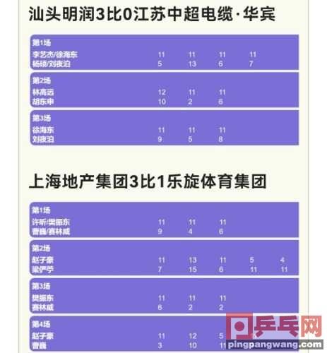上午场比赛,上海地产集团3比0击败了江苏中超电缆·华宾,此役许昕没有上场,首盘周恺/赵子豪3比0击败杨硕/刘夜泊为球队拔下头筹,紧接着樊振东以相同的比分击败了削球手胡东申,第三盘赵子豪再度上阵以3比1战胜刘夜泊,为球队拿下了制胜一分。