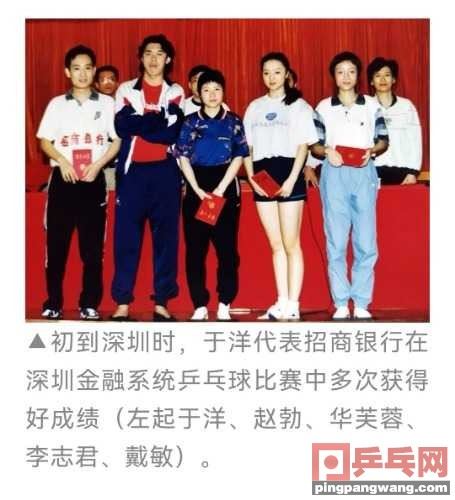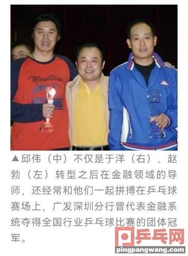 两次转行,屡创奇迹借银鹰体协乒乓球队落户深圳的东风,深圳银行系统里的乒乓人越来越多。1995年于学军担任人民银行深圳分行副行长之后,发起组织了深圳市金融系统乒乓球比赛,把银鹰体协的乒乓球运动从职业赛场铺开到整个深圳金融领域。参赛选手名单上,有人民银行姚戈(河北队),深发展银行李永旺(湖北队、原国手)、赵勃(八一队)、李志君(黑龙江队)、龙珠(八一队)、华芙蓉(浙江队)、常虹(北京队),招商银行于洋(八一队)、任峰(八一队)、戴敏(江苏队)、杨海玲(山东队),平安银行赵淼(山西队)、肖娜(湖北队)、张亚男(八一队),建设银行谷婉玲(河南队),广发银行梁冰(河南队)、成红霞(山西队、原国手),俨然是一个退役版的全国锦标赛。每年一届的深圳金融系统乒乓球比赛,办得跟专业比赛一样正规,各行也都精心准备,不少爱打乒乓球的银行高管都披挂上阵。当年在广发银行深圳分行当行长的邱伟,就是在乒乓球场上的你来我往中,慧眼相中了从柜员一路晋升到招商银行一家支行行长助理的于洋。邱伟在中学时代,曾在宜宾体校练了4年乒乓球,16岁时以隆昌县第一名的成绩考上了西南财大金融系,后来又一路读到博士,是金融界业务水平很高、也很有原则底线的一位管理者。4年的体校经历,让他对乒乓人有着天然的好感,他觉得从小练乒乓球的人,脑子灵上手快,心理素质过硬,尤其是那些能打进省市队、国家队的人,在严酷的竞争环境中磨练过意志,都有一种绝不服输的韧劲,这些特质在竞争压力极大的金融领域是非??晒蟮?。另外,通过乒乓球还可以交很多朋友,拓展业务圈。