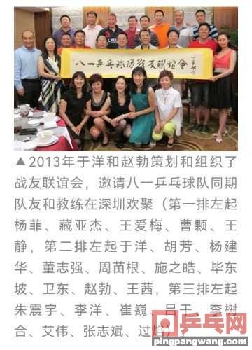 2001年,于洋转到广发银行,担任广发银行深圳分行景田支行副行长,因业绩突出很快被提升为深南支行行长。从普通职员到一个管理者,30出头的于洋肩上压力陡增,要管理业务团队,要扛起业绩指标,一切仿佛又从头来了一遍。他依然像当年做柜员那样全身心投入,在新岗位上啃下了一块又一块硬骨头,支行的存款规模直线上升,公司业务不良贷款直线下降,综合业绩连续多年在分行排名前列,还为分行培养输送了12名支行长。2011年初,他升任深圳分行副行长,分管零售及信用卡业务,把分行零售综合业务排名从总行 8 大 A 类行(深圳、北京、上海、广州、南京、杭州、郑州、东莞)最后一名提升到第一名,并持续多年保持前列。在广发的15年,于洋的业绩有目共睹。而几年前调任平安银行监事长、党委副书记、纪委书记的邱伟,在平安银行东莞分行连续亏损、困难重重的时候,又想到了于洋。2016年底,于洋再次转行,担任平安银行东莞分行行长。职务虽然提了一级,却并非美差,甚至可以说,于洋接了个“烂摊子”——存款和贷款只有几十亿,不良率超过两成,监管和人行评级都偏低。而在于洋接手的6年里,东莞分行的存贷款都上升到几百亿,不良率大幅下降到极低水平,监管和人行评级也都提升了一个等级。为于洋“引路”20多年,这位老部下的很多品质都让邱伟在心里暗暗称赞?!疤な登诜?、扎实专业、心胸宽广、懂得感恩”,这是邱伟对于洋的评价?!拔蘼凼窃诠惴⒒故瞧桨?,他在每一个岗位上的业绩都能排在同行业前三;他的学习和创新能力非常强,不光是学书本中的东西,哪怕在跟别人吃饭聊天的过程中,他也能迅速把别人的精华吸纳进去;无论对上级还是部下的提点和意见,他都能虚心倾听,员工对他都是真心的拥护?!闭庑┢兰鄱际怯惺葜С诺?,在行里每年的员工不记名打分测评中,于洋每一年都排名第一。30年始终绷着一根弦“好人缘”是于洋身上的另一个标签。于洋的“好人缘”不光是在乒乓圈子里,在金融圈更是如此,他的工作岗位到哪儿,那些大客户就跟到哪儿。在邱伟眼中,于洋的好人缘来自于他的“舍得”和感恩,“他是那种家有两口饭,给人一口半的人”。在工作中,大家最在乎的业绩,他会分给别人;自己一手培养出来的得力干将,他也舍得送出去。有一次于洋把一个业务能力很强的合规人才推荐给总行,连“受益人”邱伟也有些不解,他问于洋,“这么重要的人才走了,你自己得多费多少心”?于洋笑笑说:“往大了说,这是给总行做贡献;往小了说,有能力的人也应该得到一个更高更好的平台?!绷斓加姓庋男鼗?,员工们自然都有满满的工作动力。这些来自底层的动力无疑成为于洋成功的一块块基石,“好人有好报”,大概就是这个意思。有时候,“好人有好报”也会有另外一种注解。两年前,东莞分行有一位高管违纪违规事发,却诬陷于洋,还告到了总行。总行派来财务、纪检、人力等部门共12人的调查组,在对于洋展开了地毯式调查之后,调查组得出的结论是,这是一位太难得的优秀行长?;匾淦鹱约禾と虢鹑谌σ岳醋罴灏镜哪嵌稳兆樱谘筮裥瓴灰?,“我到平安是第一次干分行行长,我投入了全部的心血,唯一的目标就是把这个行搞好,我没有私心”。事实证明,于洋不但把东莞分行搞好了,m.wgqpnmx.cn 而且超出了所有人的预期。这6年里于洋付出了多少,他自己最清楚,旁人也看在眼里。在每年的分行行长民主测评中,于洋获得了全部无记名投票的“很好”或“好运动人生m.wgqpnmx.cn”,没有一个人投“一般”或以下的选项?!昂萌嗽怠钡牡咨侨似贰H似泛?,是周围人评价于洋时都会首先提到的,在银行系统一起打拼30年的乒乓兄弟赵勃、李永旺这样说,曾任中国银行保险监督管理委员会副部长级干部的于学军也这样说。于学军先后在人民银行深圳分行、深圳银监局、江苏银监局担任领导职务,2014年4月任国有重点金融机构监事会主席,在金融界阅人无数,他对于洋评价很高,“一个专业运动员退役后跨界到金融圈,能做出这么好的成绩,非常难得”。既有“好人缘”,又能守住底线,这是于洋身上最可贵的地方?!拔医鹑谌?0年没有一笔不良,是因为我的脑子里始终绷着一根弦、一条底线,我怕一旦这根弦松一松,人们就会联想到30年前的那个我,那个运动员出身的、不专业的我,就会辜负那么多帮助过我的、给了我宝贵机会的人?!卑阉合碌钠古仪虮昵┨乩创颖贝笱芯可弦?、比于洋晚十几年进入金融圈、在投行业也小有成就的前世界冠军孙晋,一说起于洋就两个字:很牛!她觉得这位八一队的师兄很早就摆脱了运动员的影子,成为了一名非常优秀的金融人。而事实上,在快节奏的生活和高压力的工作之外,于洋最放松的时候就是跟打球时交的朋友聚在一起。2013年,他和赵勃还策划组织了八一乒乓球队战友联谊会,邀请八一队的教练和同期的战友们到深圳小聚,后来各省市的乒乓队纷纷效仿八一队搞起了怀旧联谊会?!?013年于洋和赵勃策划和组织了战友联谊会,邀请八一乒乓球队同期队友和教练在深圳欢聚(第一排左起杨菲、藏亚杰、王爱梅、曹颗、王静,第二排左起于洋、胡芳、杨建华、董志强、周苗根、施之皓、毕东坡、卫东、赵勃、王茜,第三排左起朱震宇、李洋、崔巍、吕干、李树合、艾伟、张志斌、过焰)。30年前那个贴着运动员标签、把“鱼目混珠”当成目标的年轻人,曾经是于洋最不