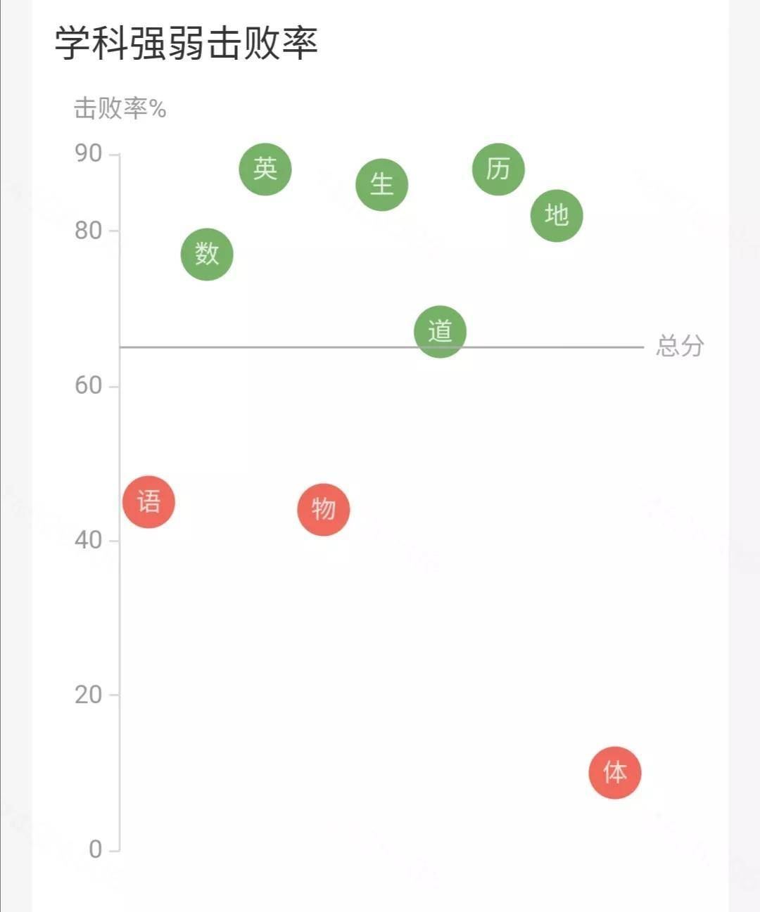 不仅如此,还有学科强弱击败率分析图?;靼?5%以上的同学为A+,击败20%以上的同学为A,击败5%以上的同学为B+。在学校,“六边形战士”就是那些门门功课优秀、没有跛脚科目的同学。