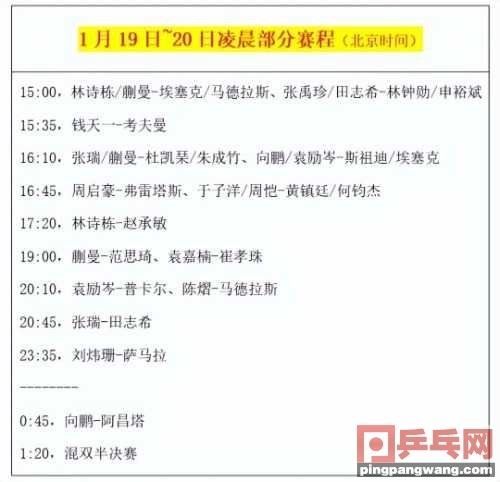详细赛程与看点请看下文。在前几天的资格赛与正赛较量中,国乒遭遇了多方的冲击,其中男单10人损失6位,女单8人被淘汰2个,双打7对组合中也有3对出局,而且大多是输给了外协会对手,形势很不乐观。1月19日下午15:00,国乒混双“独苗”林诗栋/蒯曼登场,迎战匈牙利的埃塞克/马德拉斯,难度一般。