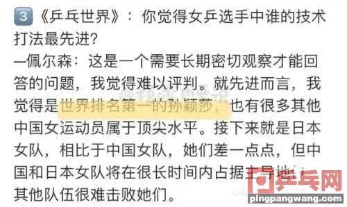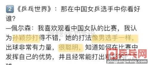 佩尔森运动人生m.wgqpnmx.cn说:“就先进而言,我觉得是世界排名第一的孙颖莎,也有很多中国女队运动员属于顶尖水平……”问题2:那在中国女选手中,你看好谁?佩尔森回答:我喜欢看看中国女队的比赛,我认为孙颖莎打得不错,她的打法像男选手一样有力量,很聪明,知道如何在比赛中发挥自己的优势,并且经常打出精彩的回合球。