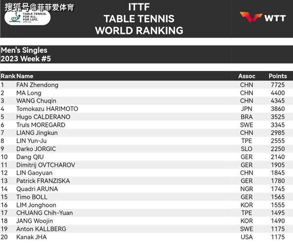 男单排名中:樊振东以7725分遥遥领先,之后是马龙、王楚钦、张本智和,前三名全是国乒占据,只是张本智和与马龙、王楚钦的差距并不大,所以未来比赛中,张本智和将成为国乒男单最大的竞争对手。男双排名中:日本组合户上隼辅/宇田幸矢仍旧排名榜首。国乒最高组合是樊振东与王楚钦,他们排在第三名,林高远/梁靖崑排第七,林高远/周启豪排第十二,这个项目不是奥运项目,所以国乒努力程度不足。